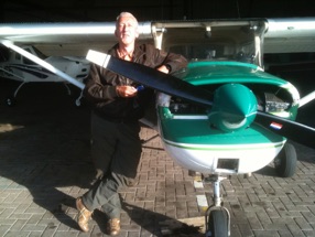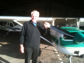 Door dat schrijven over vliegen begon het toch weer te kriebelen. Ik ben dus net (april 2010) weer gaan vliegen met Jim, mijn toenmalige instructeur, op een Cessna 150. De vorige keer dat ik hem zag was tijdens de jaarlijkse proficiency-check twaalf jaar geleden, en het was een plezierig weerzien! Het was ook twaalf jaar geleden dat ik in een Cessna 150 had gevlogen. Ziehier: Meester en Leerling na een fijn uurtje vliegen terug in de Skyriders hangaar op Lelystad Airport. En ja, ik kon het nog wel beetje.....