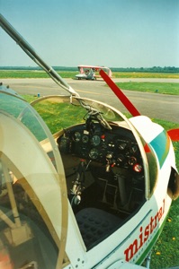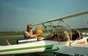 Lang voor die periode had ik wel eens in een sportvliegtuigje gezeten, en ook in een zweefvliegtuig. Maar de vliegkoorts sloeg pas echt toe na een bezoek aan de open dag van zweefvliegveld Terlet in de lente van ’93. Daar waren verschillende stands van vliegscholen, en vooral “Skyriders” uit Lelystad trok mijn aandacht. Zij waren present met een klein, pittig ogend, tweedekkertje waarin je getweeën naast elkaar zit. Het bleek een Mistral, gebouwd door AviaSud in Zuid Frankrijk, en voorzien van een Rotax tweecylinder 582 cc tweetaktmotor, goed voor een dikke 50 pk.