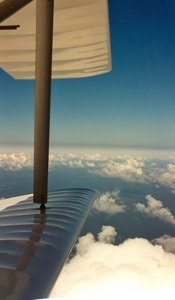 Na zestien lessen van gemiddeld een uur en zo’n 70 landingen had ik alle verplichte oefeningen onder de knie, en dan ga je uitkijken naar je eerste solovlucht. Om solo te gaan moet ‘t weer perfekt zijn: geen turbulentie en weinig wind, en al zeker niet dwars op de baan. Een week later op een mooie rustige zomeravond had ik mijn 18e les, en m’n instructeur had een portofoon meegenomen: een veelbelovend teken. Wij samen de lucht in, ”circuitjes” gedraaid met 7 prima landingen. En toen, na drie kwartier, de opdracht voor een “full-stop” aan het eind van de baan. De instructeur stapte uit en zou kontakt met me houden via z’n portofoon als ik alleen de lucht in ging voor drie rondjes. De eerste keer laag overvliegen, dan een circuit met landing oftewel “touch-’n-go”, en na het derde rondje landen voor “full-stop”. Ik taxiede terug naar het begin van de baan, draaide, gaf volgas en schoot weg. De Mistral klom veel sneller nu er maar één persoon aan boord was, en ik zat in no-time op de circuit-hoogte van 400 voet. En toen drong het pas echt tot me door: FIRST-SOLO ! En ik slaakte woeste vreugdekreten.