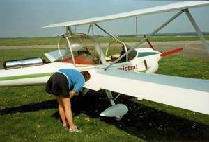 José doet een pre-fligt-check voordat ze gaat lessen in de Avia-Sud Mistral ultralight; hier bezig aan de “trimtab” van het rolroer annex ondervleugel.